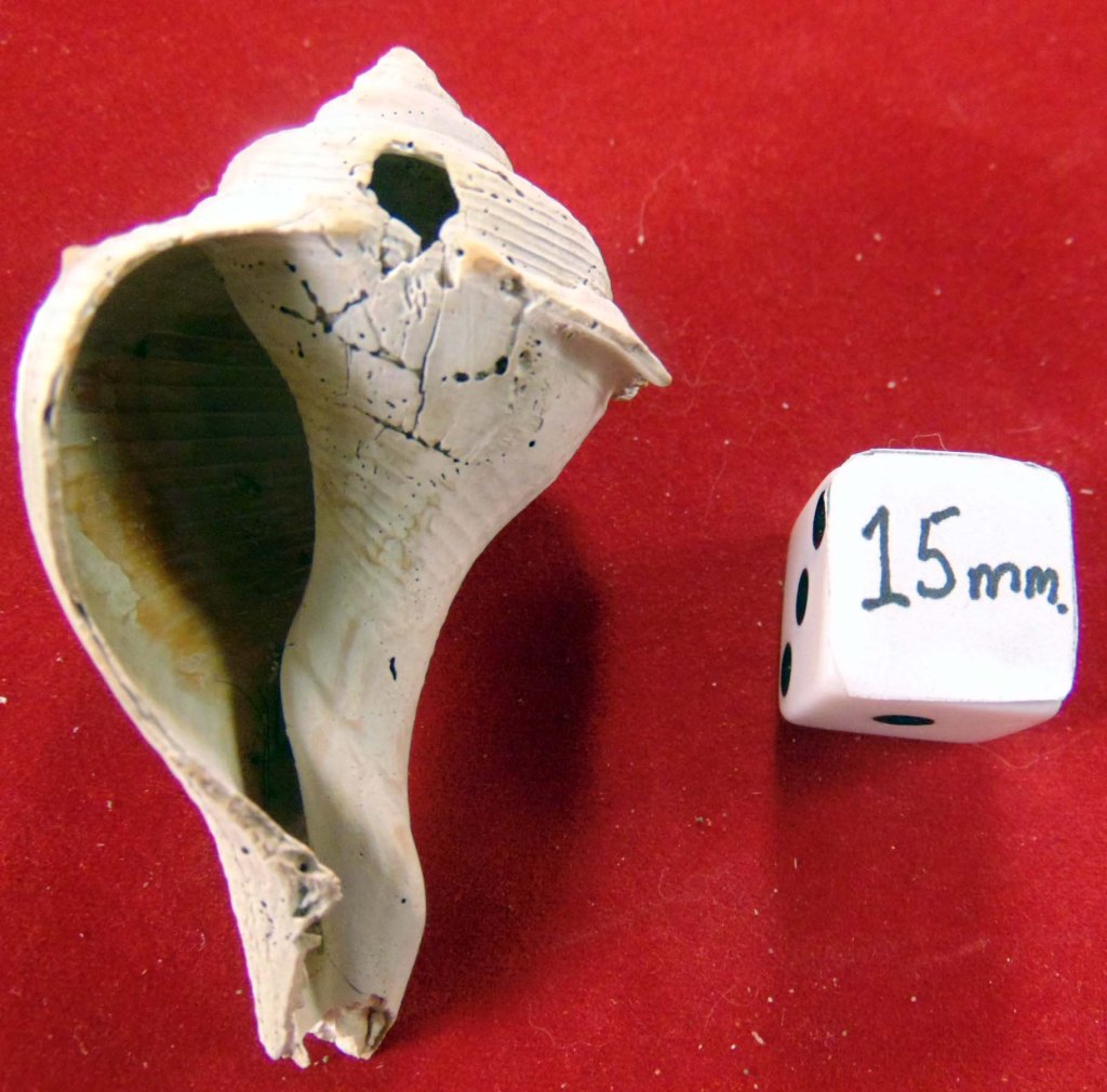 Medium, smooth-ish shell with faint traces of knobs – some damage on the underside – opens to the left