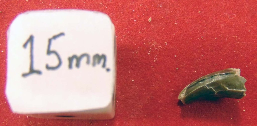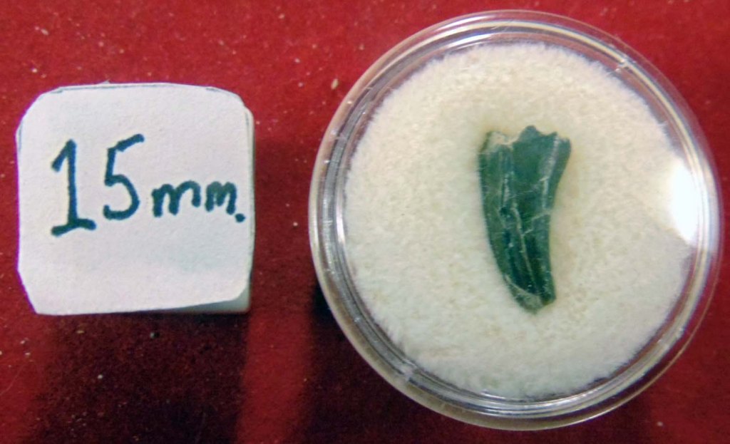 A small, brown tooth with some enamel missing near the tip on one side and a worn tip