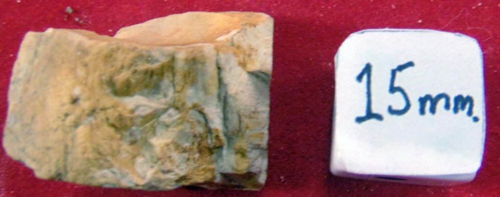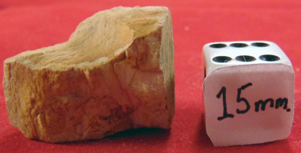 A orangey-tan bone fragment with an almost ‘petrified wood’ look to it.