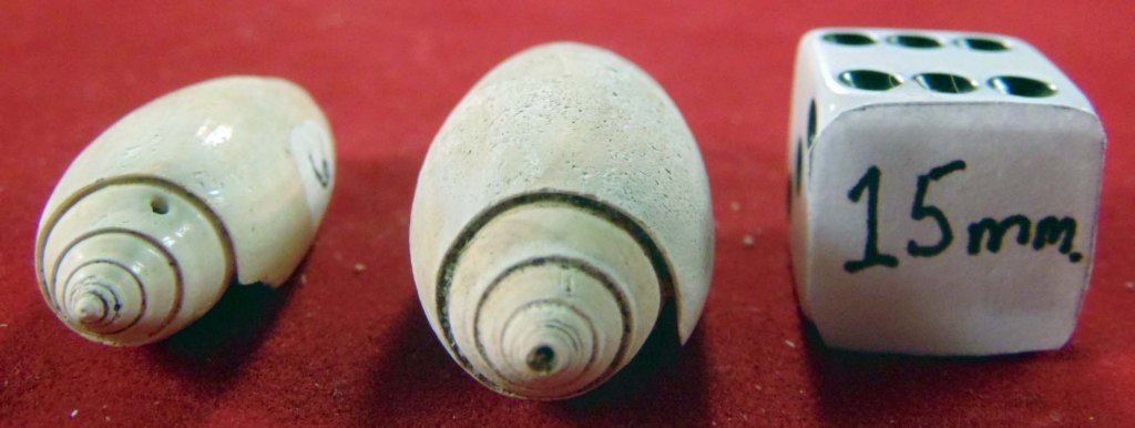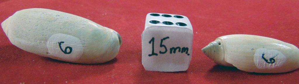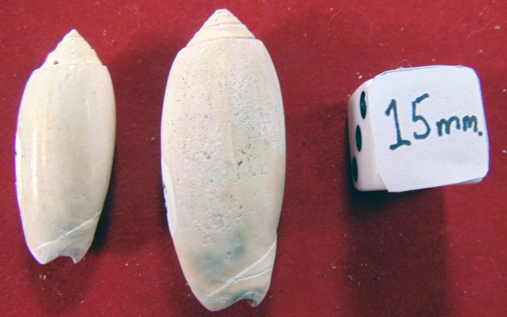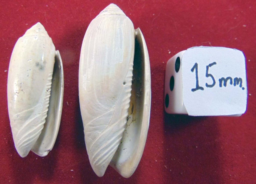 - Specimen 17: Small, shiny cigar-shaped shell – opens on the right