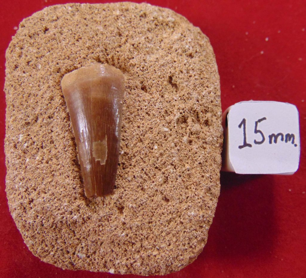 A fairly straight, carnivore tooth with brown enamel with some delamination in a sandstone matrix