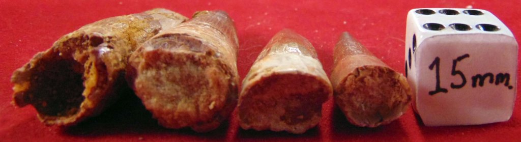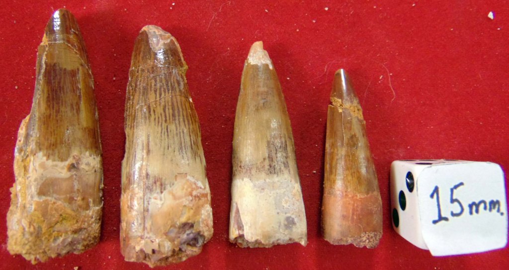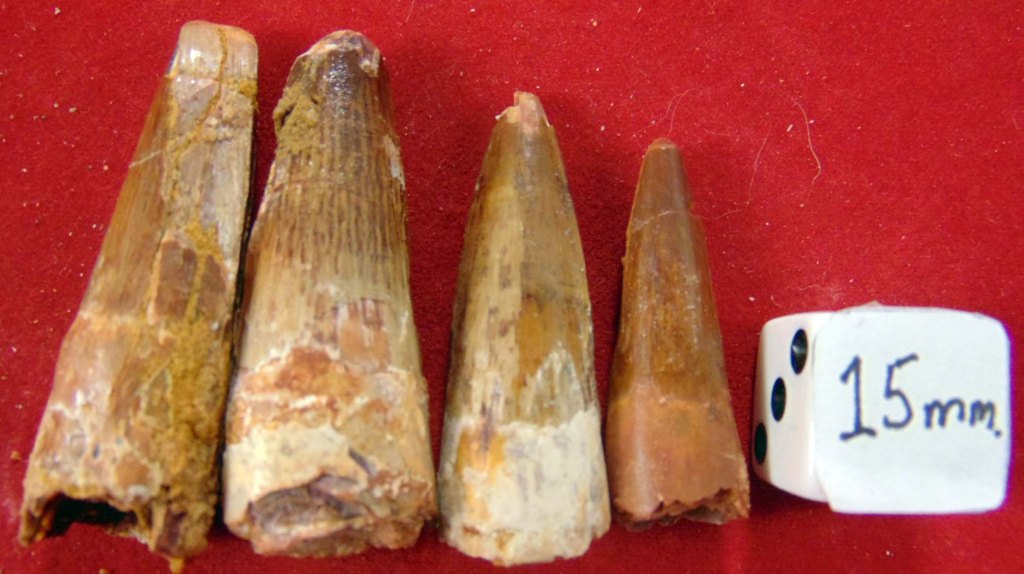 - Specimen 12: A small, slender rust red tooth with a repaired tip