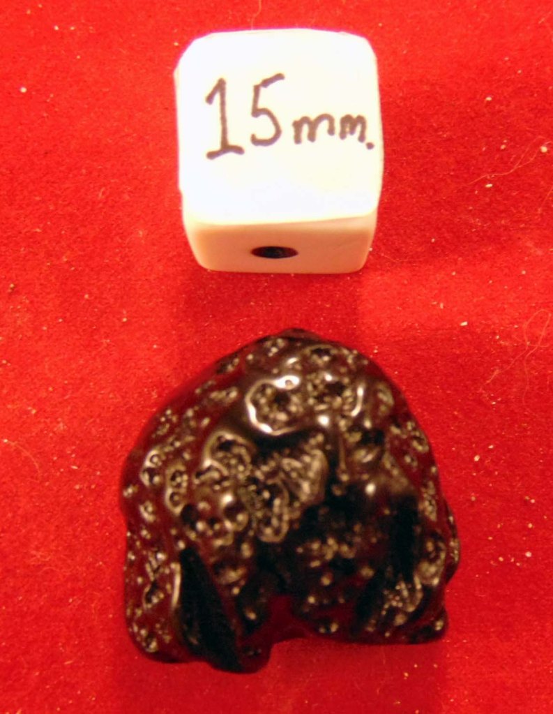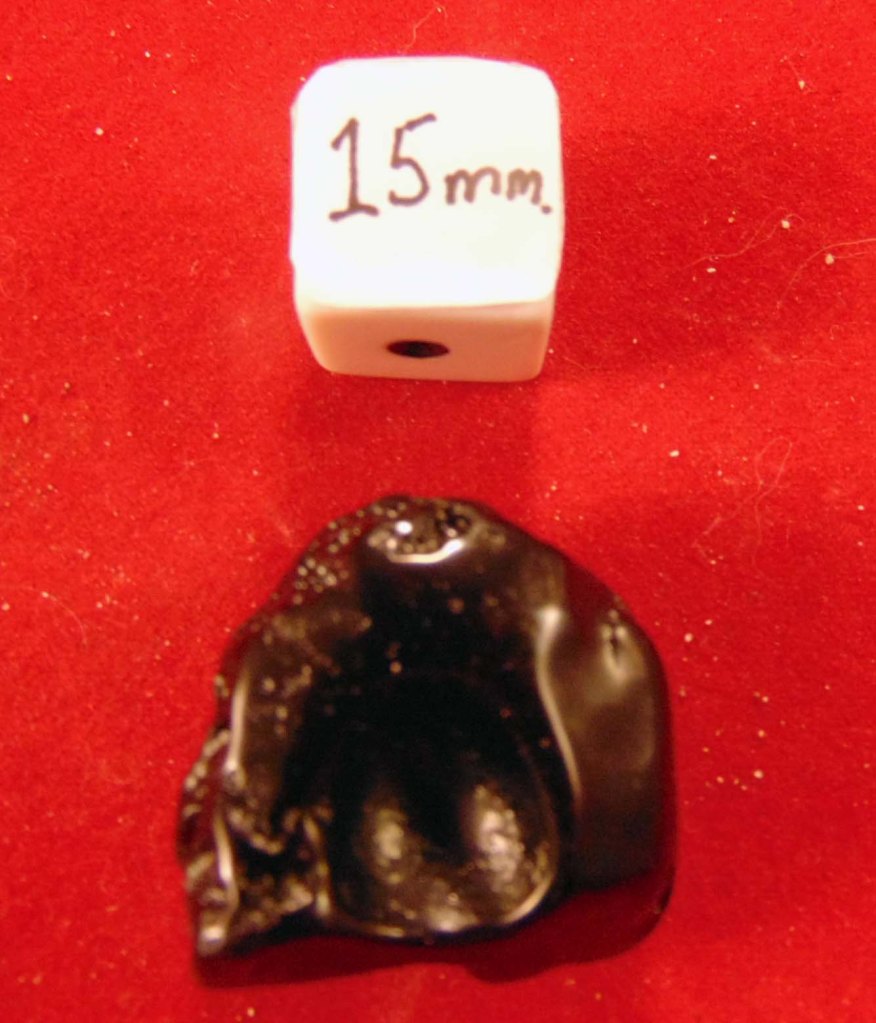A round, mostly smooth, black stone with pitting as well as a thumb-sized divot in one side