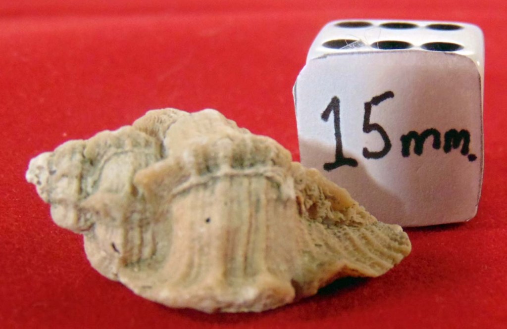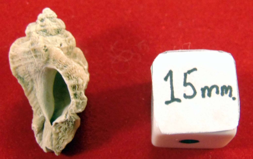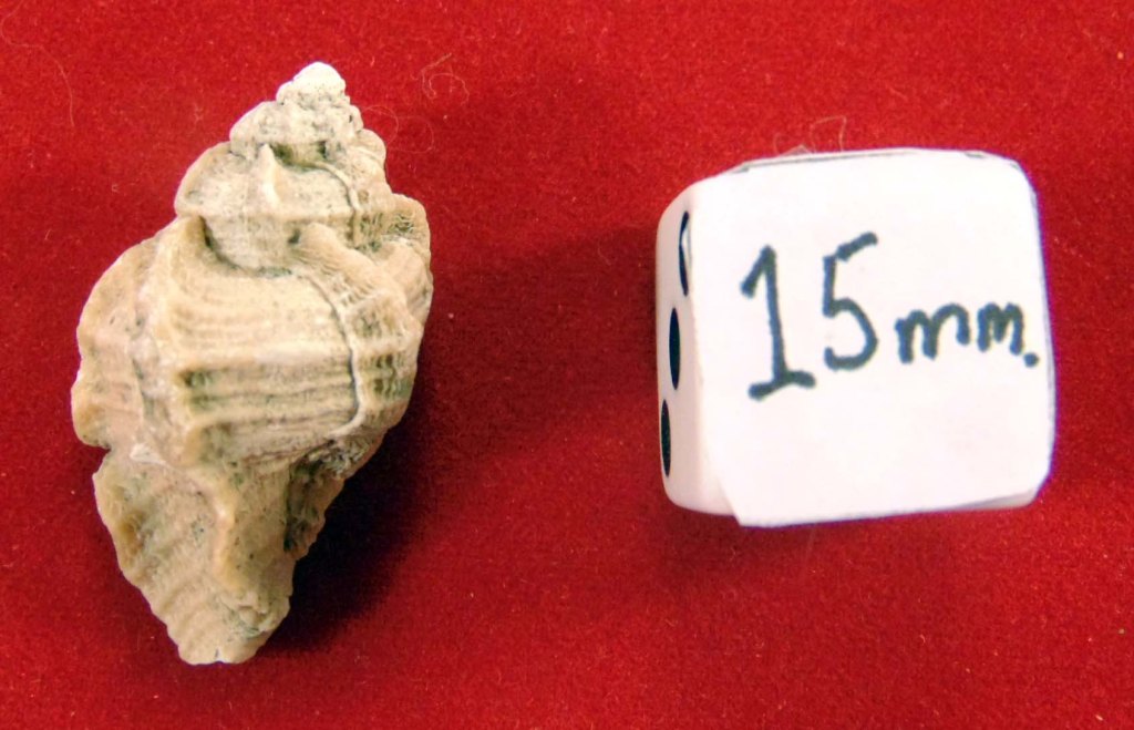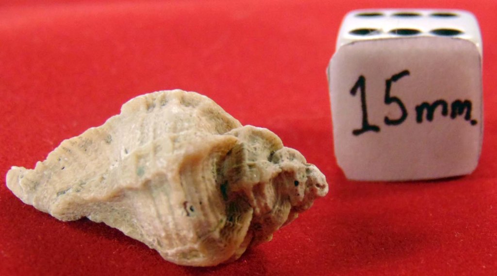 Small, off-white snail shell with prominent ridges – opens to the right when viewed from the bottom