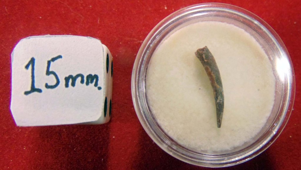 A slender, curved red tooth with a sharp point