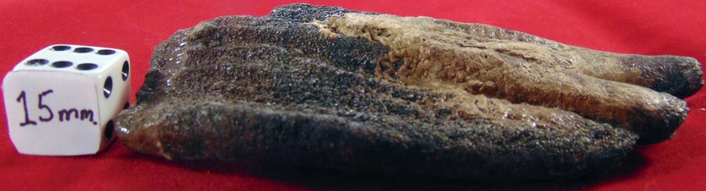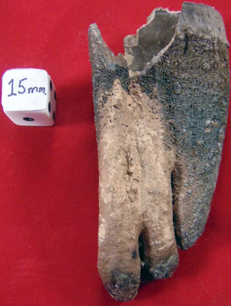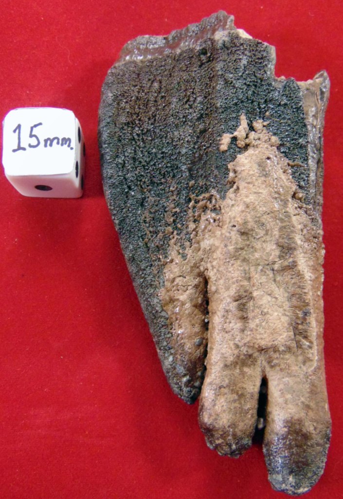 A medium-sized tooth fragment with three lobes and a bleached area on both sides of the fragment