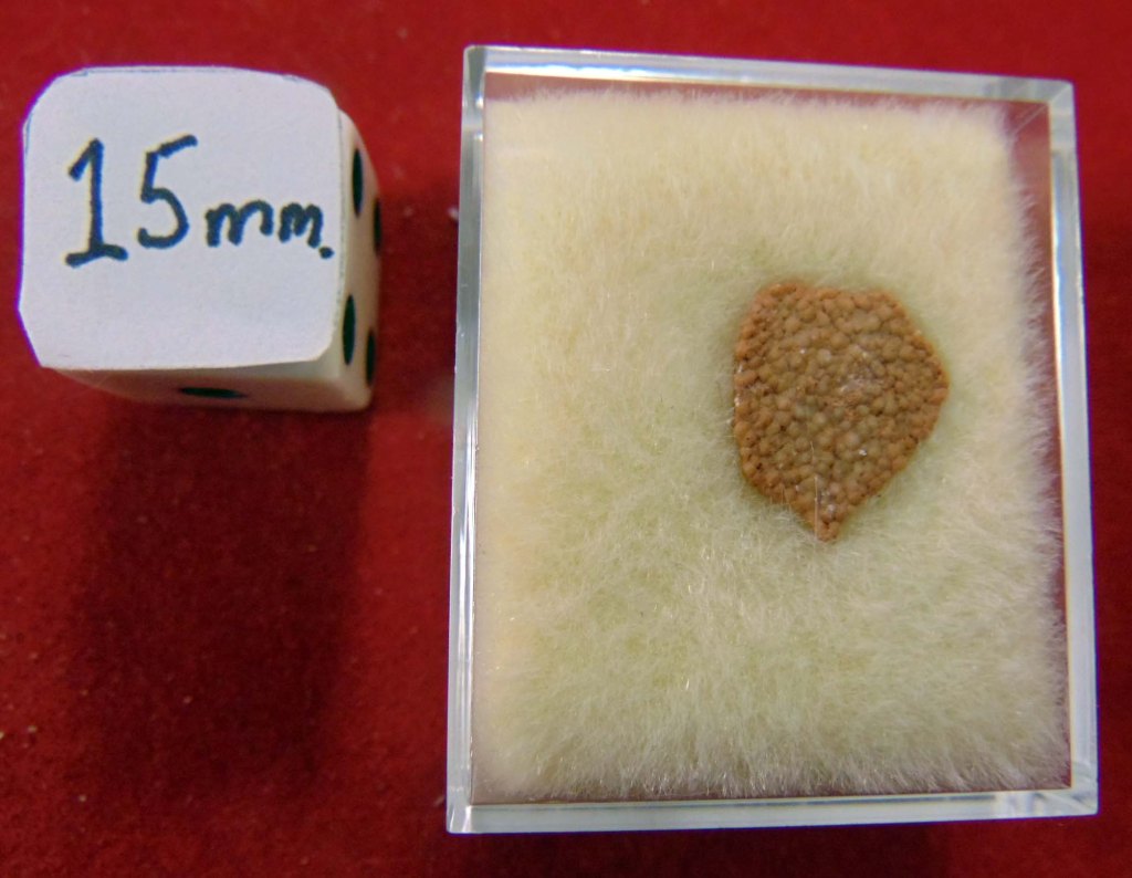 A small, reddish orange egg shell fragment with a bumpy texture