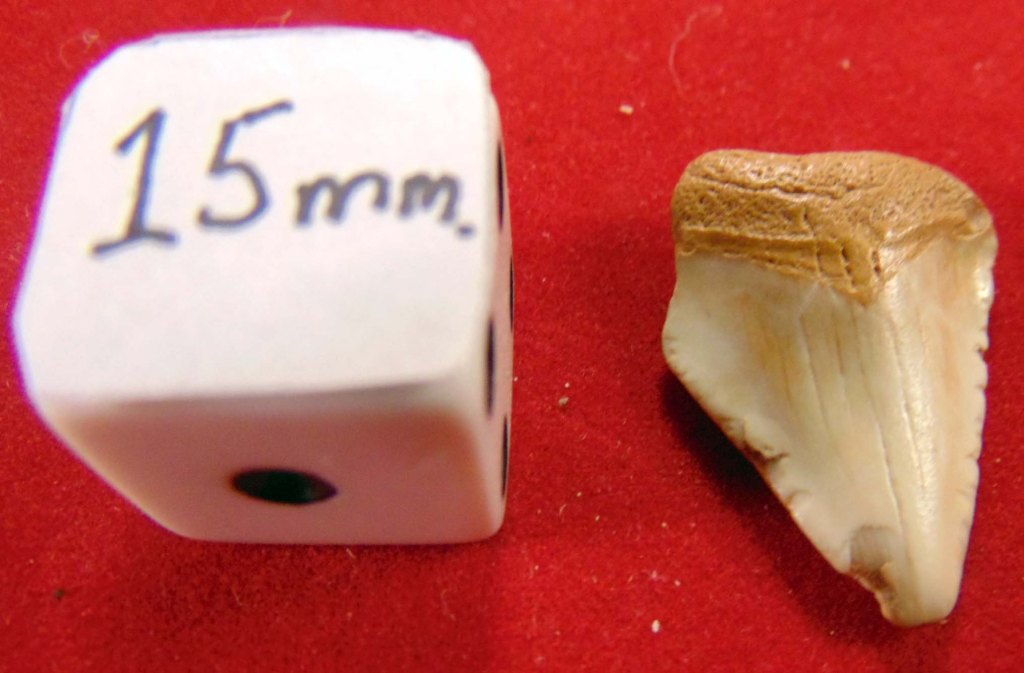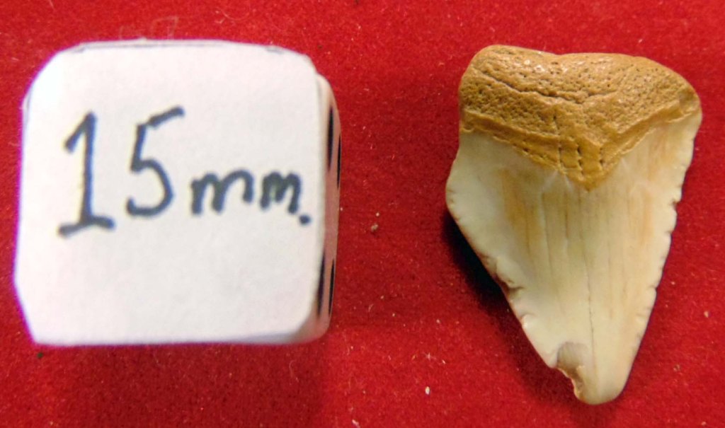 Small tooth with white enamel; perfectly triangular with a small number of deflections and an orangey root