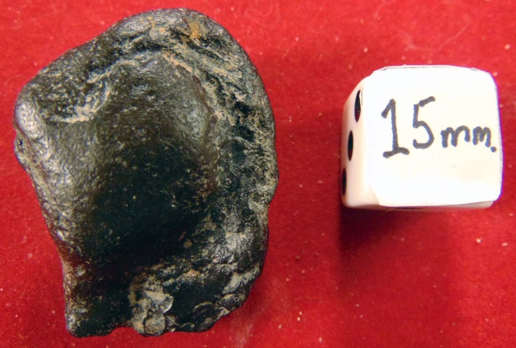 Black rounded shape with distinct impressions and markings indicating an inner ear impression