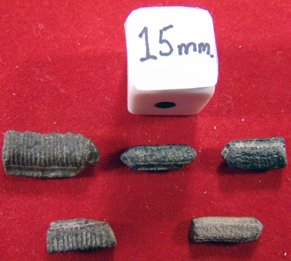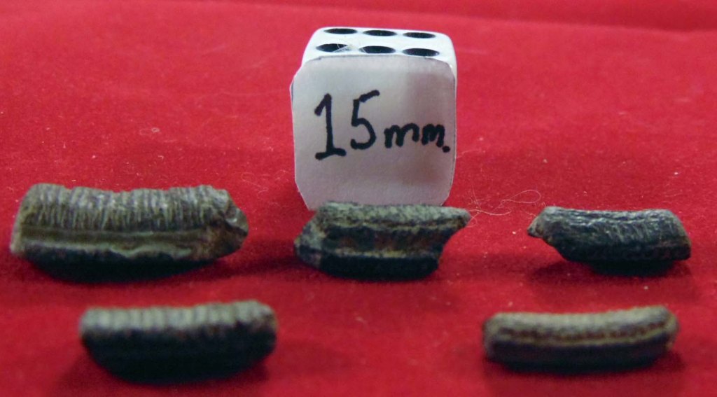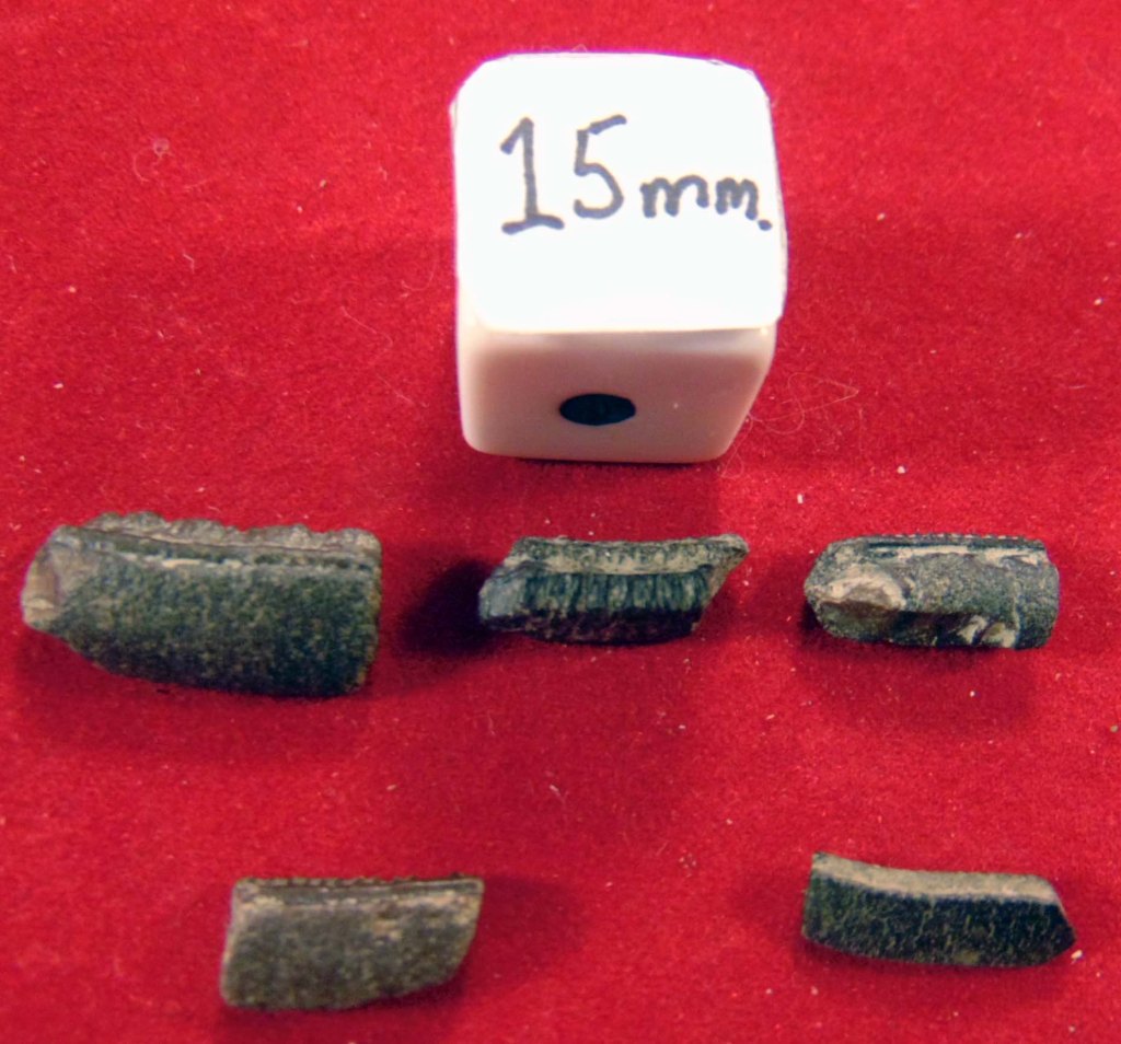 - Specimen 15: Worn down dental plate fragment, but ridges visible on the sides