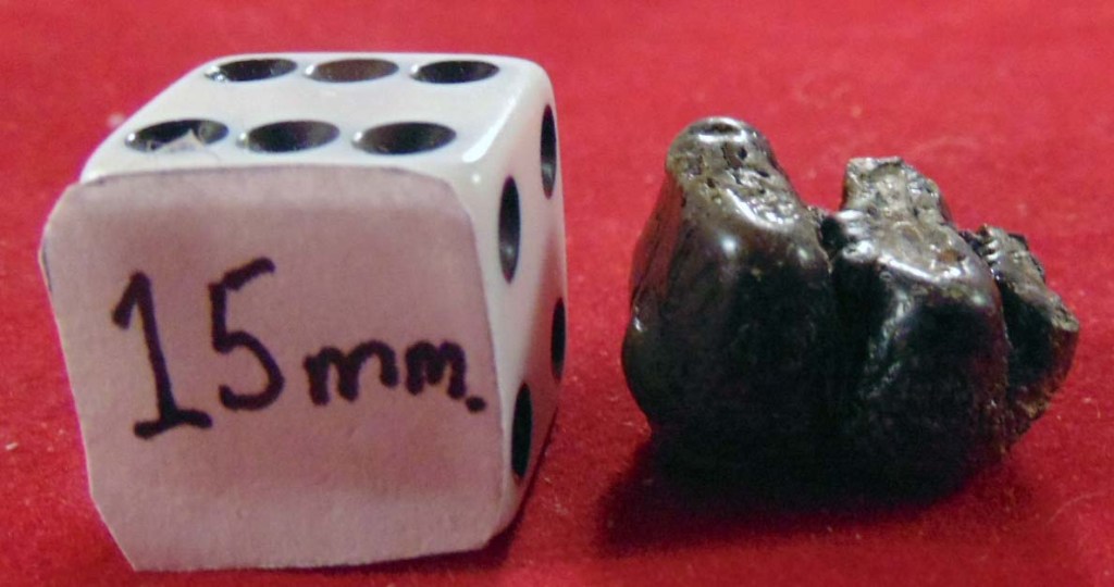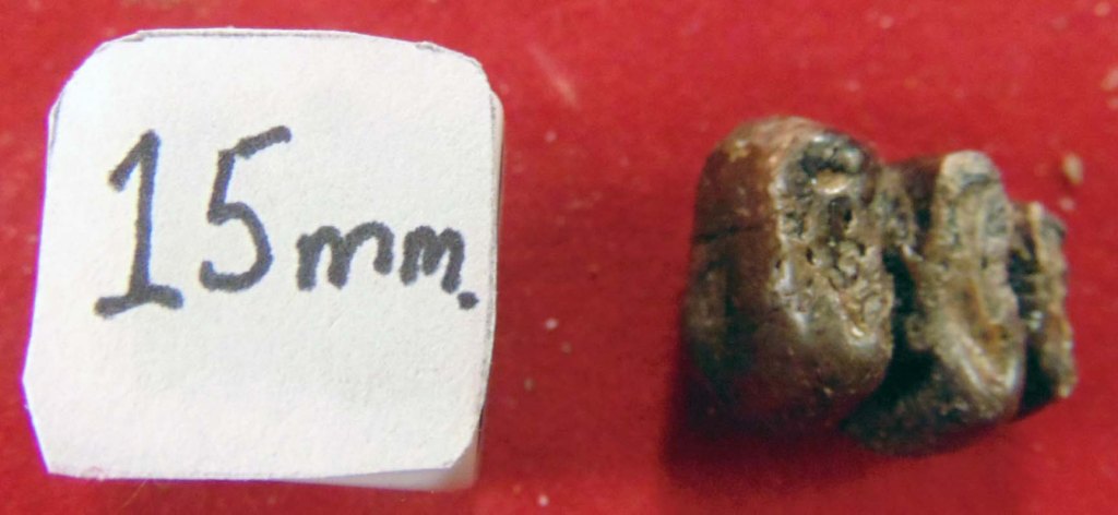A three-lobed, worn down molar with no root, it has blue-black enamel