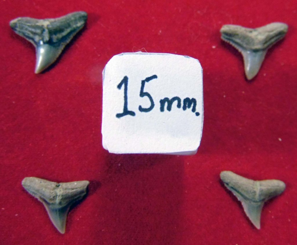 - Specimen 59: Tooth with light grey enamel that darkens towards the root, dark brown root, fine serrations near the base – slight curve to the left