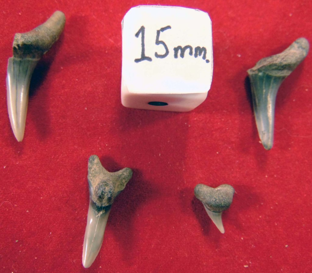 - Specimen 73: Tooth with tan enamel that turns bluish near the root with black striations, left lobe of the sharply curved root is broken off