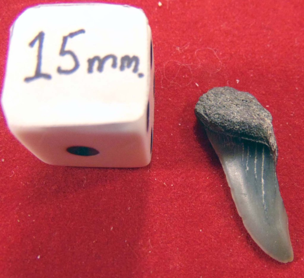 Half of a bulky black tooth with striation and shape consistent with smaller megalodon teeth