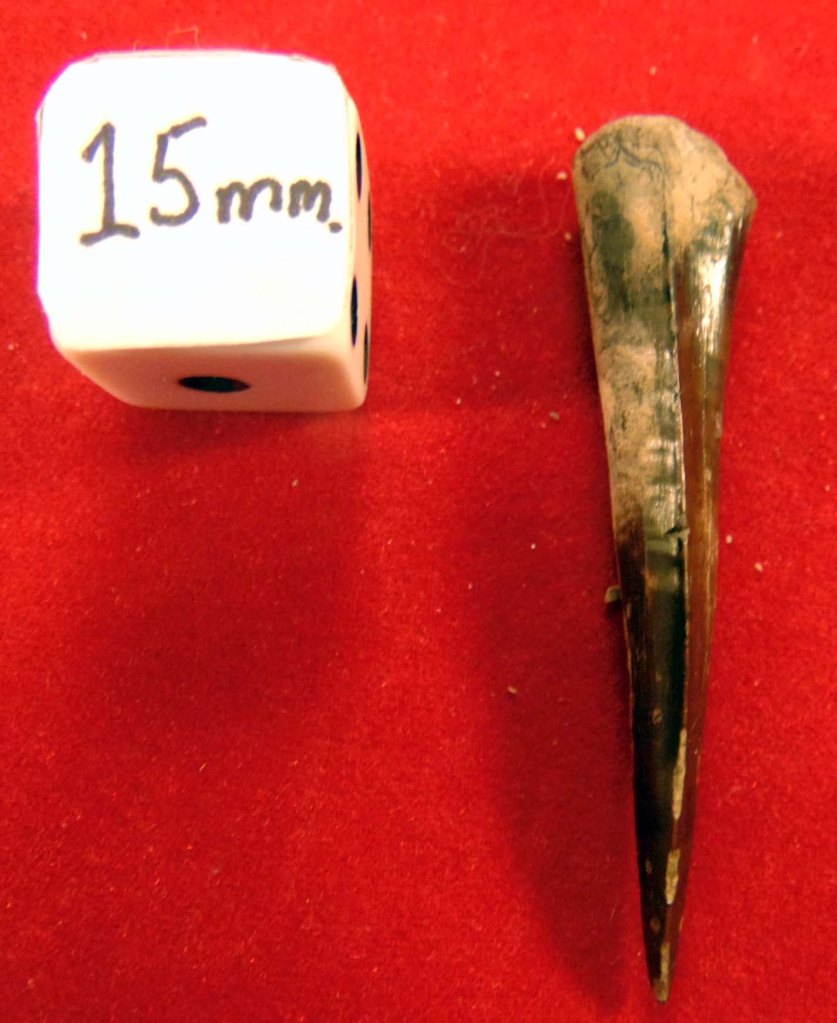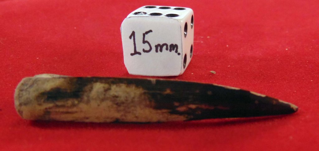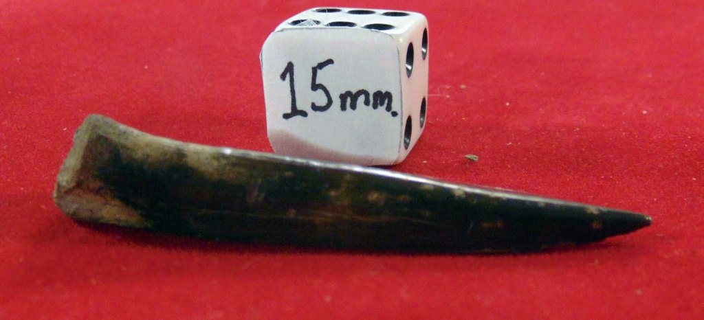 Long, tapered tooth with glossy black enamel with rust brown marks