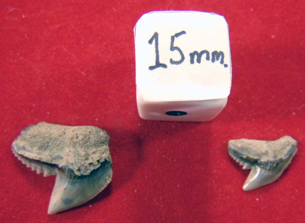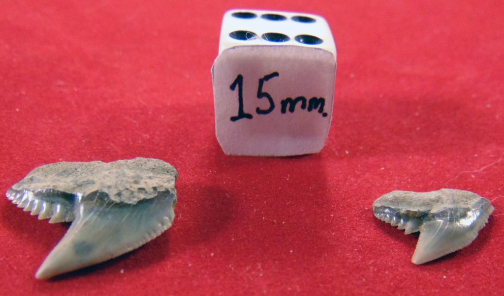 - Specimen 71: Small tooth with pale enamel that darkens to dark brown near the root, light coloured root, pronounced serrations on left side of the base – sharp curve to the left