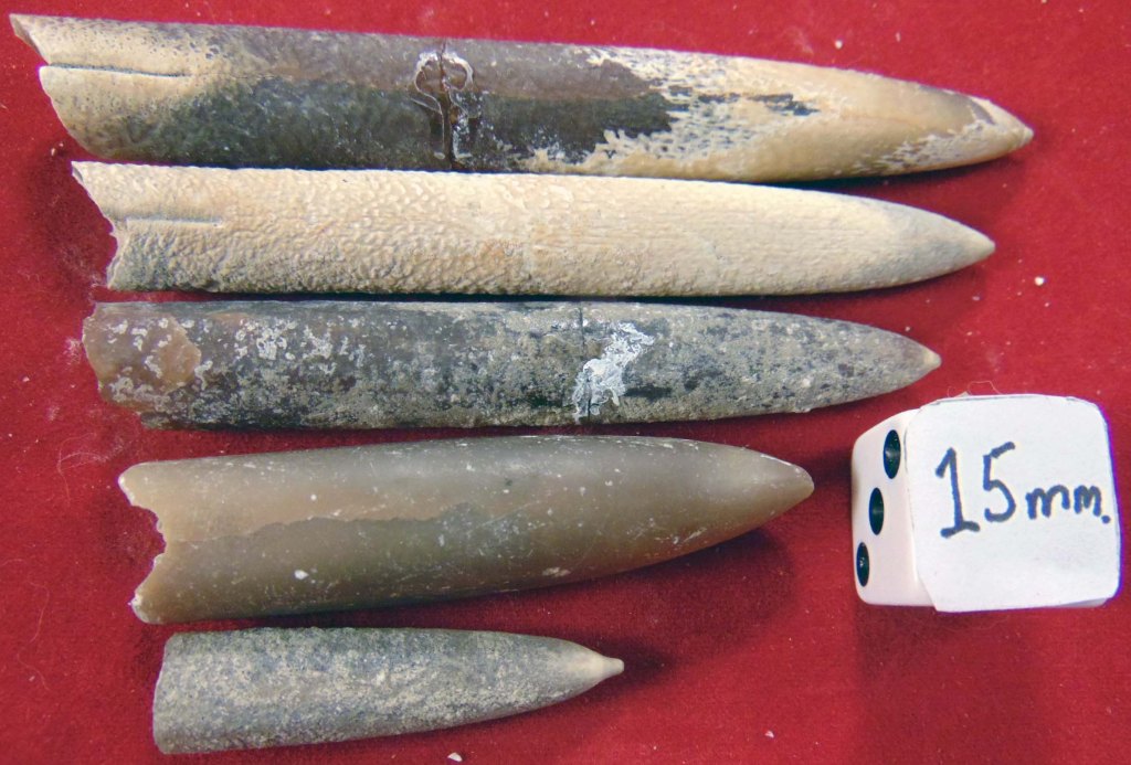 - Specimen 05: Translucent amber-brown guard, very smooth with sediment removed from inside
