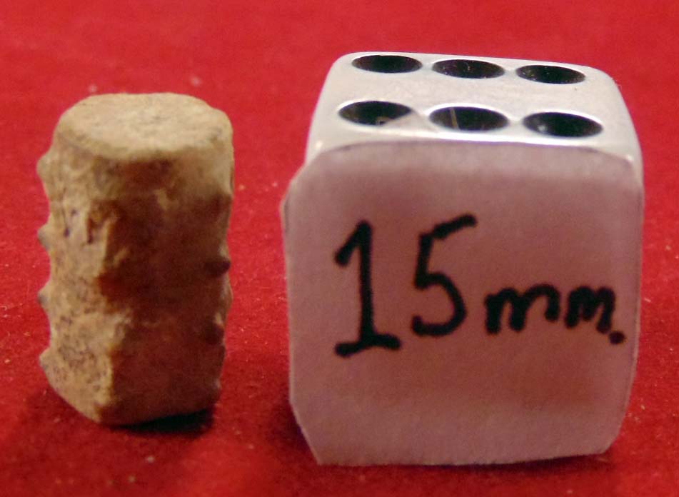 A small, cylindrical piece of crinoid stem with small raised bumps in equidistant columns around the stem segment