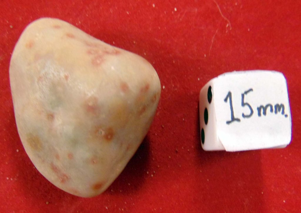 An extremely smooth, off-white stone with some rust-coloured spots