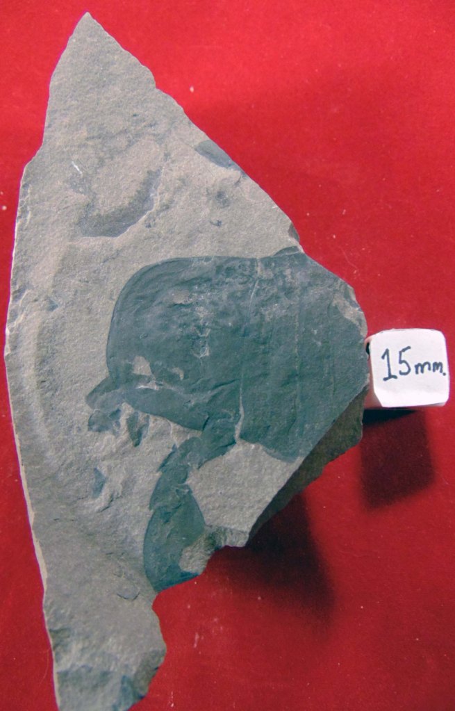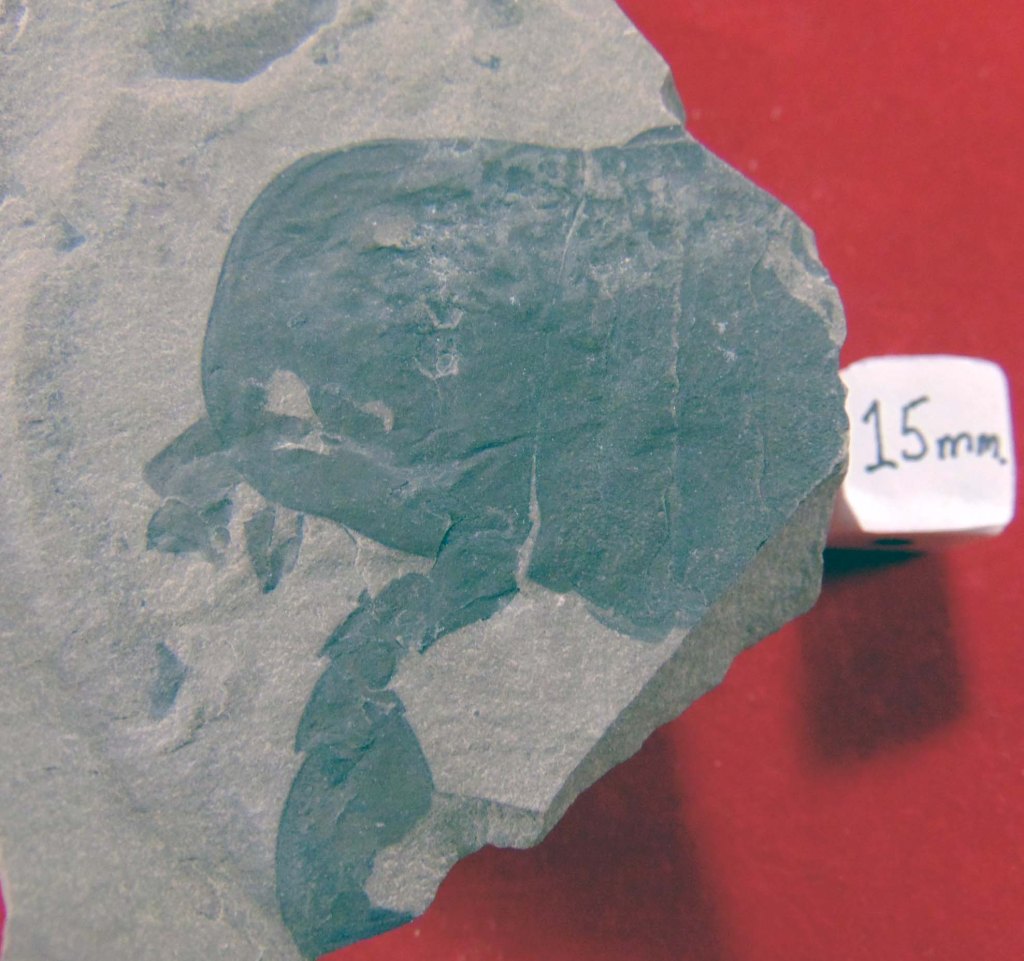 A black preservation of a rounded head plate, most of a swimming paddle, and four clearly defined thorax plates on a thick piece of grey shale