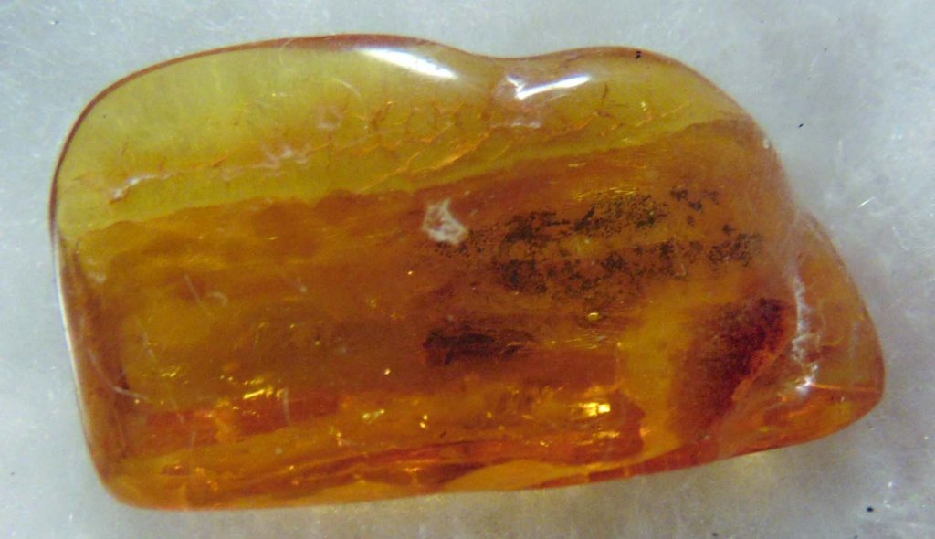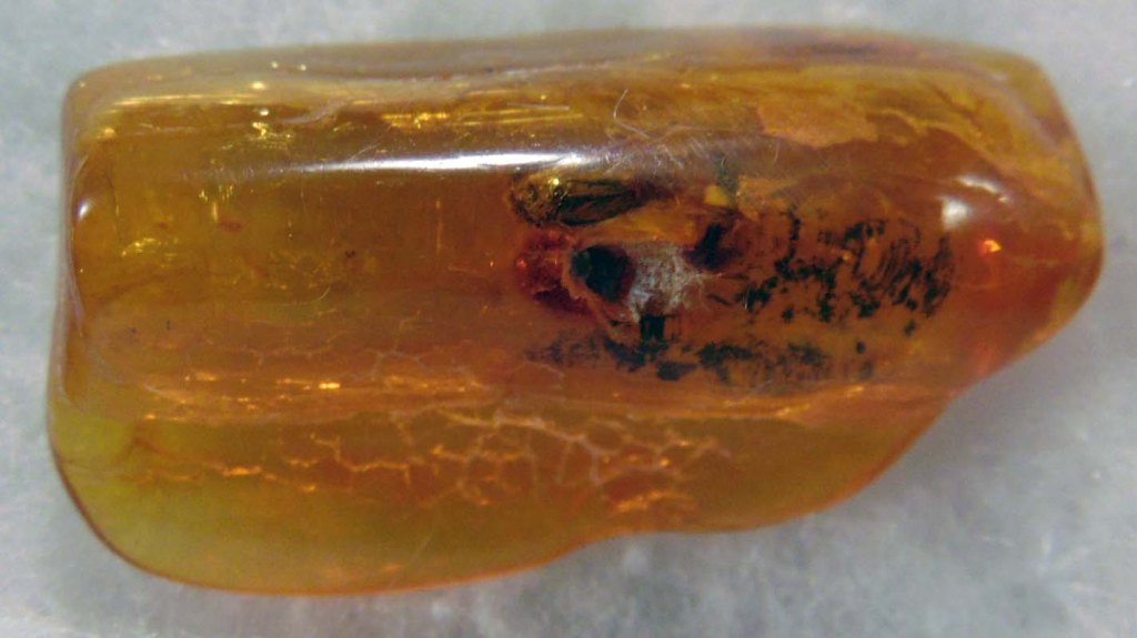 A caddisfly in an orangey-gold piece of Baltic amber
