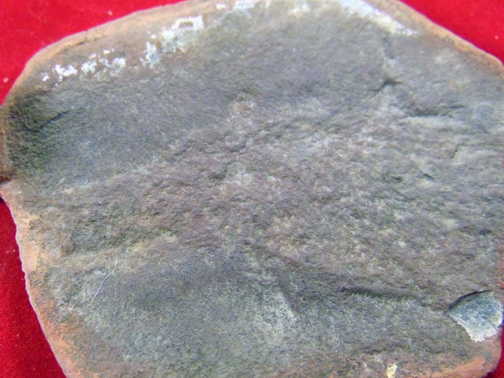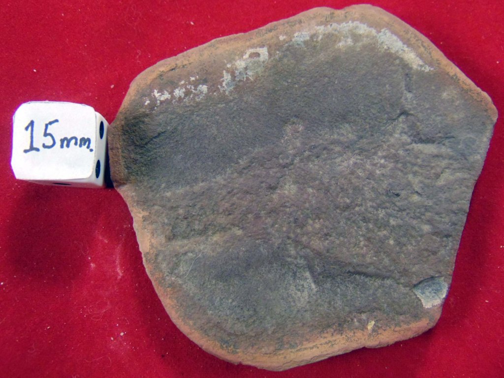 One half of a split nodule – edges are reddish brown, but the centre is dark brown, faintly seen are a cylindrical body bisected by a bar with rounded ends; the body continues into a sort of arm, but it does not complete