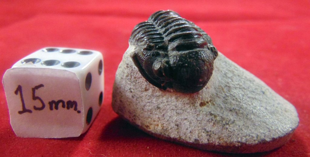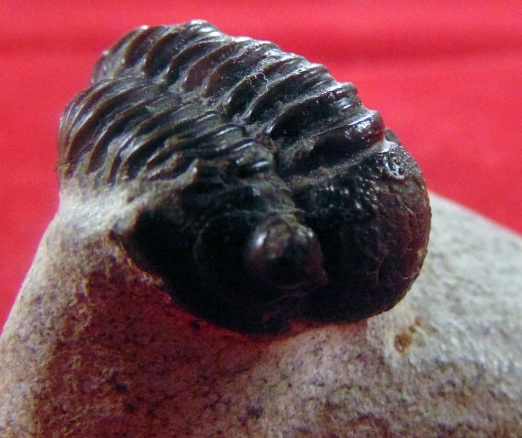 A small, black trilobite with a bumpy glabella and holochroal eyes