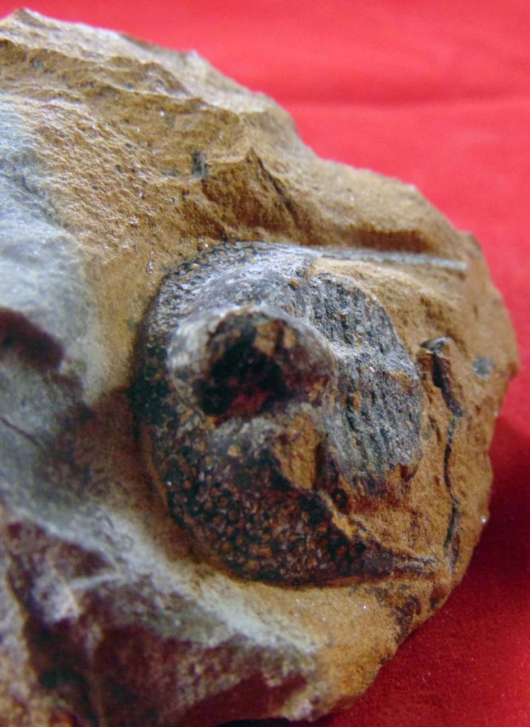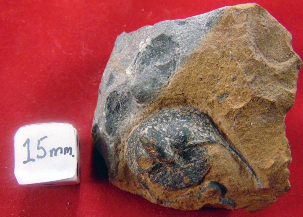A small trilobite with a short body and a large cephalon with swept back lobes and a large glabella on a sandstone matrix