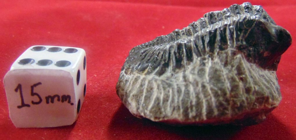 A black, unusual looking trilobite with large eye ridges, but eyes not visible